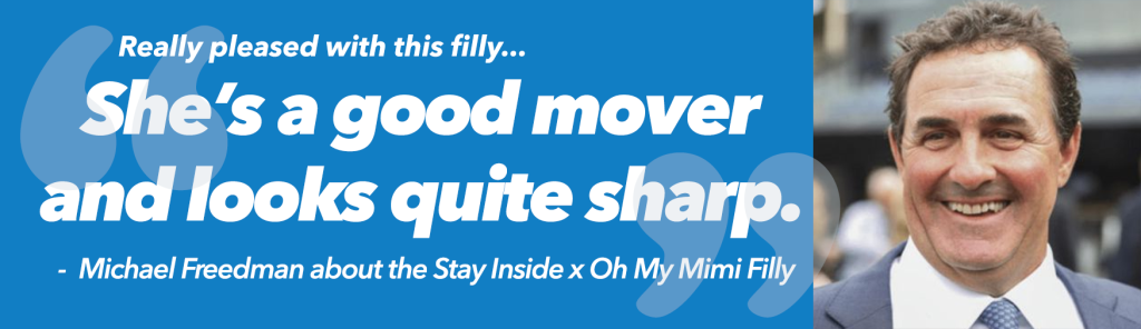 • “Stay Inside is the best 2YO colt I’ve ever had anything to do with. He has elite talent and an electric turn of foot.” – co-trainer Michael Freedman